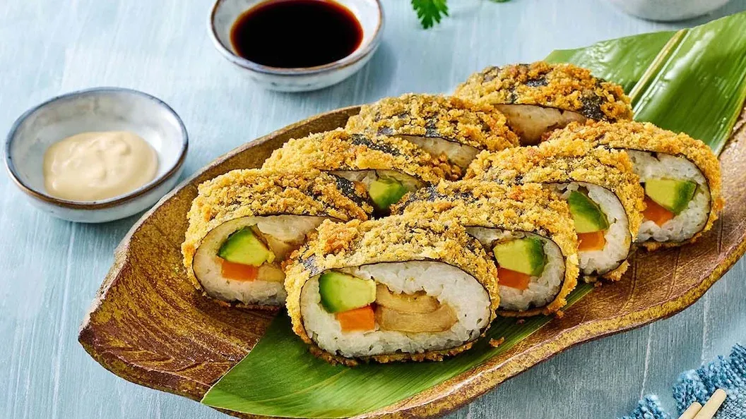 - Tempura: Dybstegte stykker grøntsager eller tofu bruges som fyld eller topping. En særlig lækkerbidsken: Sprød tempurarulle med østershatte.