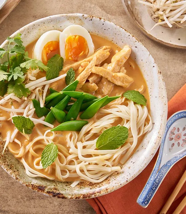 Aromatisk curry mee med mør kylling, sprøde grøntsager og ægnudler i en fyldig kokos-teriyaki-bouillon. Det er en solid skålfuld hyggemad, der er færdig på bare 35 minutter.