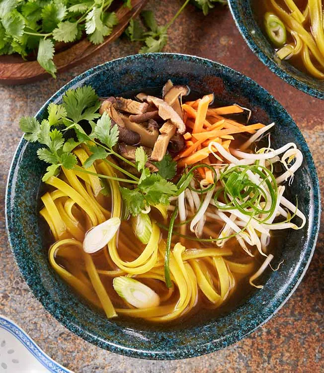 Aromatisk vegetarisk pho med tofu, shiitake-svampe og friske grøntsager i en smagfuld bouillon med stjerneanis, kardemomme og ingefær. Let, sund og fyldt med umami med Kikkoman glutenfri sojasauce.