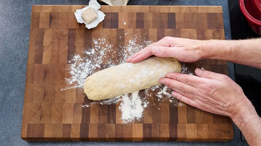 Skær brødet i tern. Bland mel, salt, mælk, smuldret gær, sukker og æggeblomme sammen til en glat dej. Fold brødternene i dejen, dæk den til, og lad dejen hæve et varmt sted i ca. 1 time. Form dejen til en lang rulle, og damp den over varmt vand eller i en dampkurv i ca. 20 minutter.