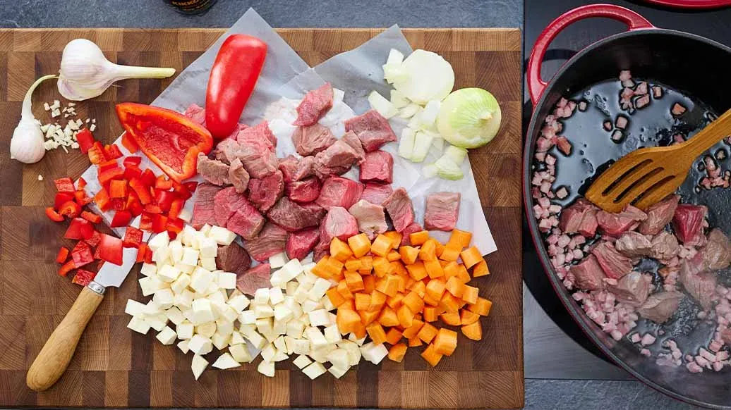 Opvarm olie i en kasserolle eller tykbundet pande, og brun vildtkødet og bacon i ca. 8-10 minutter. Skær peberfrugt, gulerødder, pastinakker og løg i tern, hak hvidløget fint, og hæld det hele på panden. Steg det hele i 8 minutter under jævnlig omrøring.