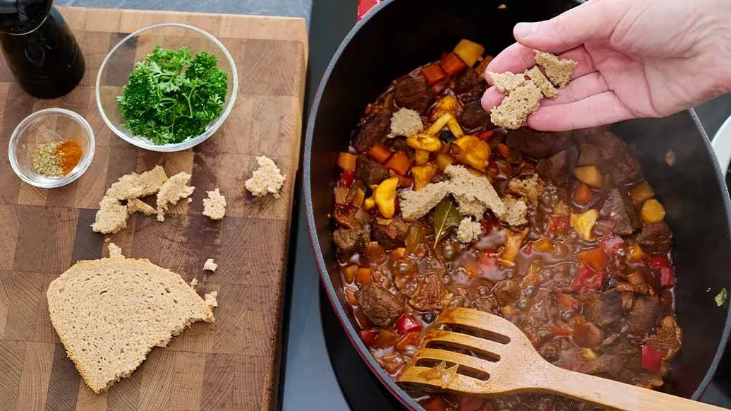 Fjern skorpen fra brødet, og riv brødet i mindre stykker. Brug det til at tykne gullaschen med, og smag til med peber, chilipulver og merian. Vask og tør persille, og pluk bladene fra stænglerne. Skær dumplingrullen i skiver, anret dem på tallerkener sammen med den færdige gullasch, og pynt med persille inden servering.