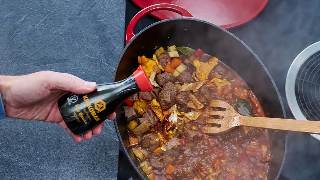 En festlig gryderet med svampe, rodfrugter og tørret frugt, der får dybde af rødvin og Kikkoman sojasauce. Retten serveres med dumplings og er en perfekt fyldig, sød og krydret gullasch, der passer til festlige vintermåltider.
