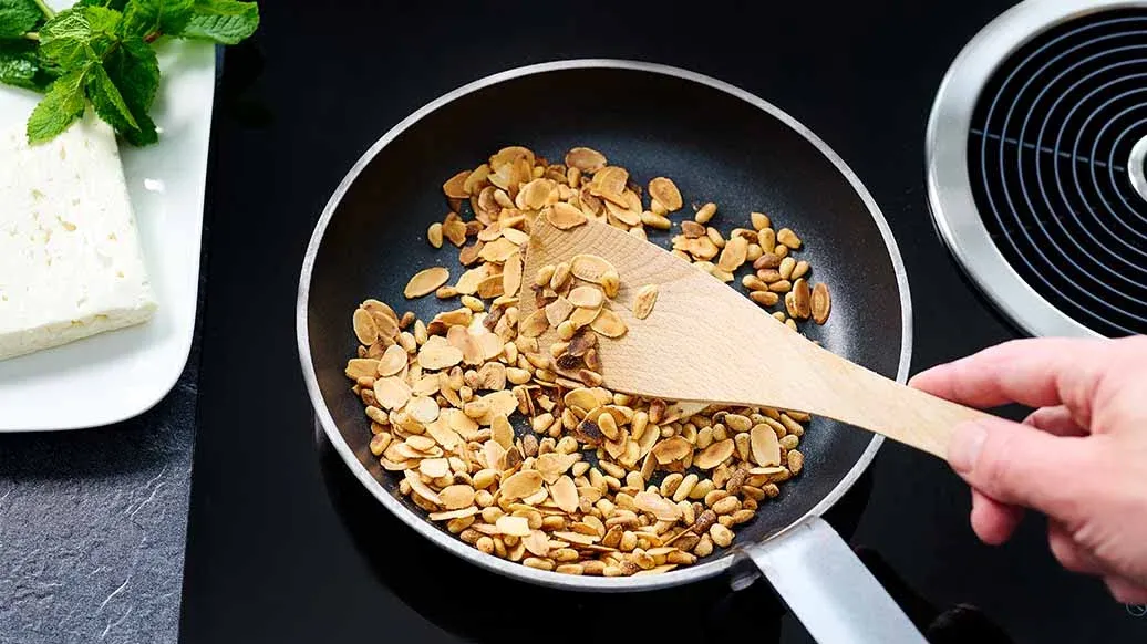 Rist mandelflagerne og pinjekernerne på en lille slip-let-pande i ca. 3 minutter, indtil de er gyldenbrune. Smuldr fetaosten.