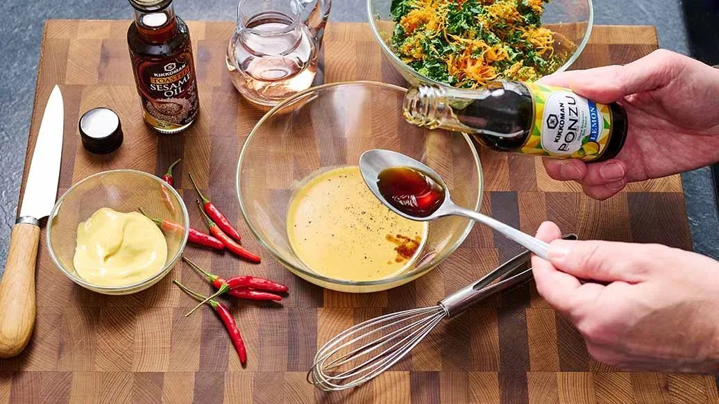 Hak chilien fint til dressingen. Pisk den med Kikkoman ponzu citrus sojasauce, Kikkoman sesamolie, eddike, sennep og agavesirup, og smag til med peber. Bland dressingen med grønkål, broccoli og gulerødder.