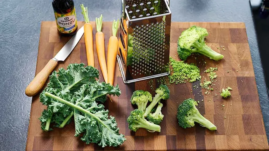 Riv grønkålen i mindre stykker, og riv broccolien og gulerødderne fint.