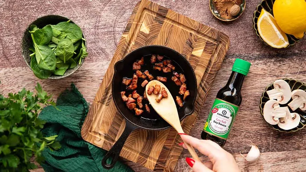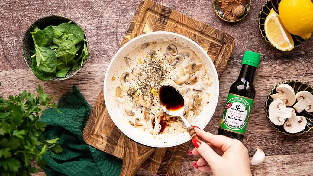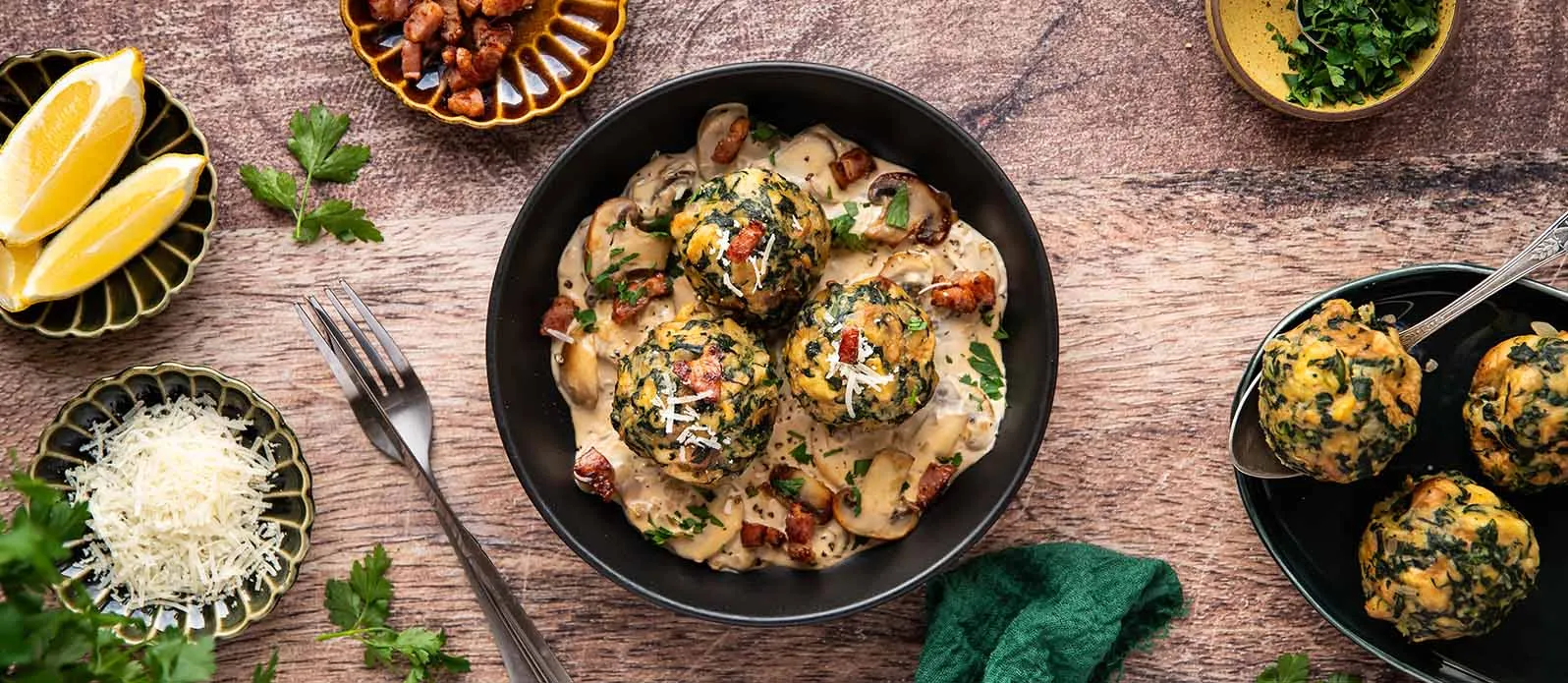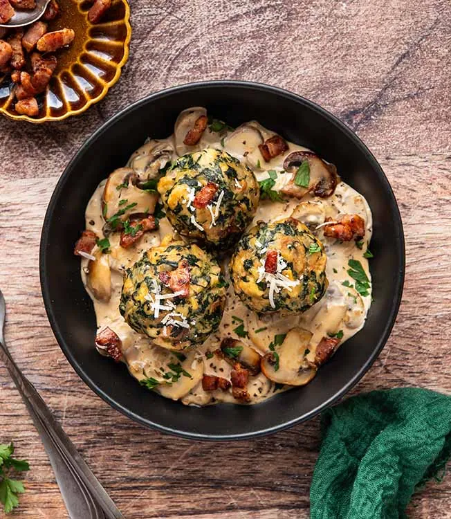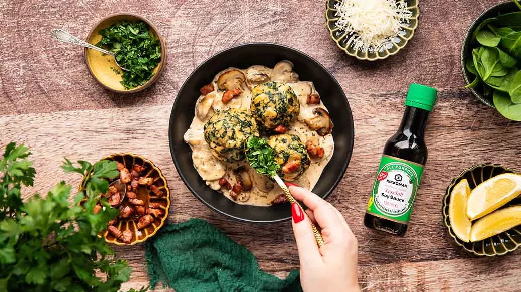 Lette brøddumplings med spinat lavet af overskydende brød, forfinet med Kikkoman sojasauce med mindre salt, og serveret med en cremet svampesauce og sprød bacon. Det er en enkel, hyggelig ret, hvormed overskydende brød udnyttes på lækker vis.