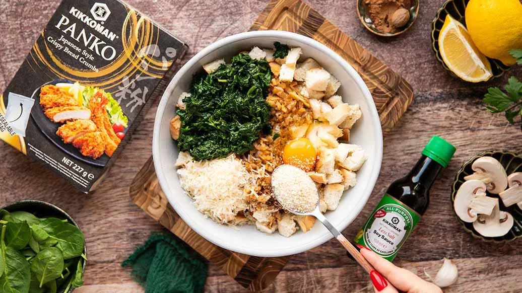 10 g smør – 180 g finthakket babyspinat – 40 g finthakket løg – 60 ml mælk – 1 ½ spsk. Kikkoman Naturligt Brygget Sojasauce Med Mindre Salt – ⅓ tsk. friskmalet sort peber – ¼ tsk. muskatnød – 150 g gammelt brød, i tern – 15 g Grana Padano, revet – 1 ½ spsk. Kikkoman Panko - sprød rasp i japansk stil – 1 æg