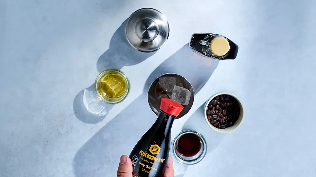 40 ml skotsk whisky – 40 ml kirsebærlilkør – 120 ml espresso (2 shots) – 20 ml ahornsirup – 2 skvæt Kikkoman Naturligt Brygget Sojasauce – 16 isterninger (en isterning vejer omkring 20 g)
