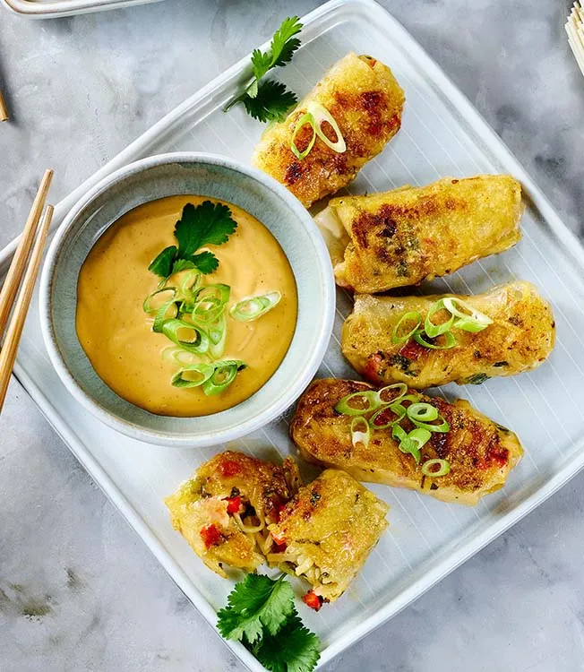 Hurtige, sprøde rispapirdumplings fyldt med ramen, grøntsager og ost, smagt til med Kikkoman kimchi chilisauce og Kikkoman sojasauce. De serveres med en cremet, stærk dip og er perfekte som et let måltid eller en nem snack, som alle vil elske.
