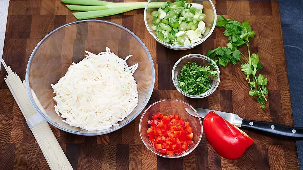 Kog nudlerne i henhold til pakkens anvisninger, og skær dem i mindre stykker. Skær forårsløget i skiver. Hak korianderen fint, og skær den røde peberfrugt i tern.