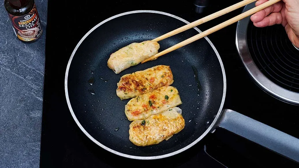 Opvarm Kikkoman sesamolie i en stor pande, og steg de færdige dumplings i 4-6 minutter, indtil de er gyldenbrune på alle sider.