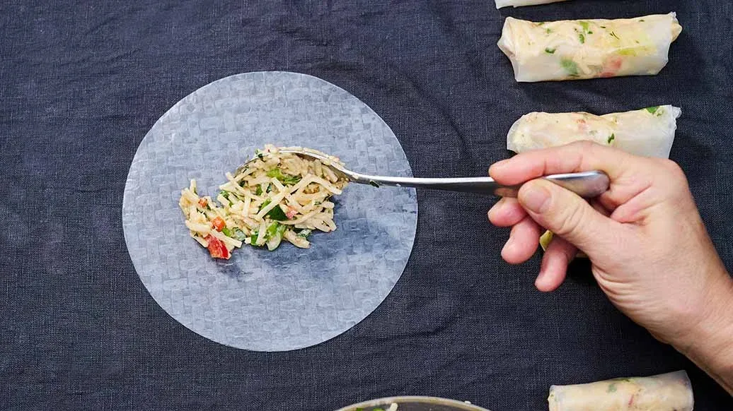 Dyp kort hvert ark rispapir i koldt vand, og læg det på et fugtigt viskestykke. Læg ca. 1 spsk. fyld på hvert ark, fold siderne op om fyldet, og rul rullen sammen.