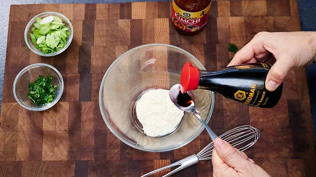 4 ½ spsk. mayonnaise – 1 tsk. Kikkoman Krydret Chilisauce til Kimchi – 2 tsk. Kikkoman Naturligt Brygget Sojasauce – 1 kvist koriander (eller persille) – 1 forårsløg