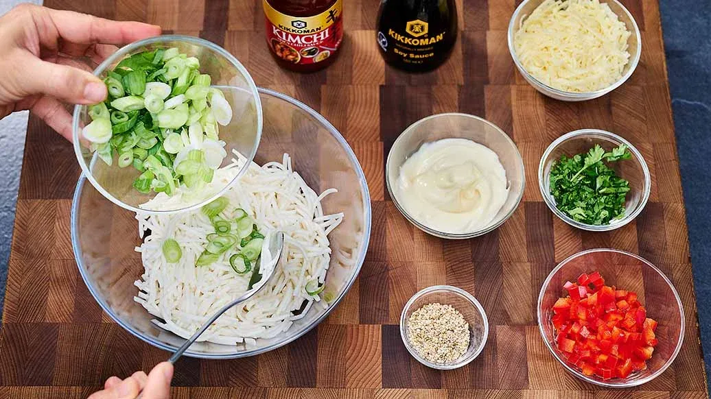 Bland nudlerne med to tredjedele af forårsløget, koriander, rød peberfrugt, sesamfrø, Kikkoman kimchi chilisauce, mayonnaise, ost og Kikkoman sojasauce.
