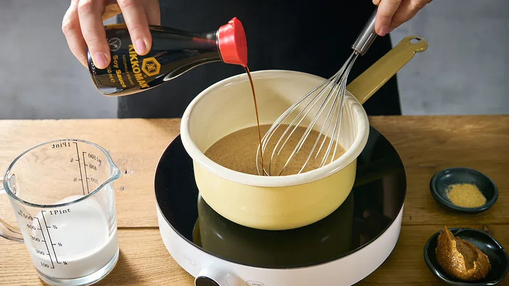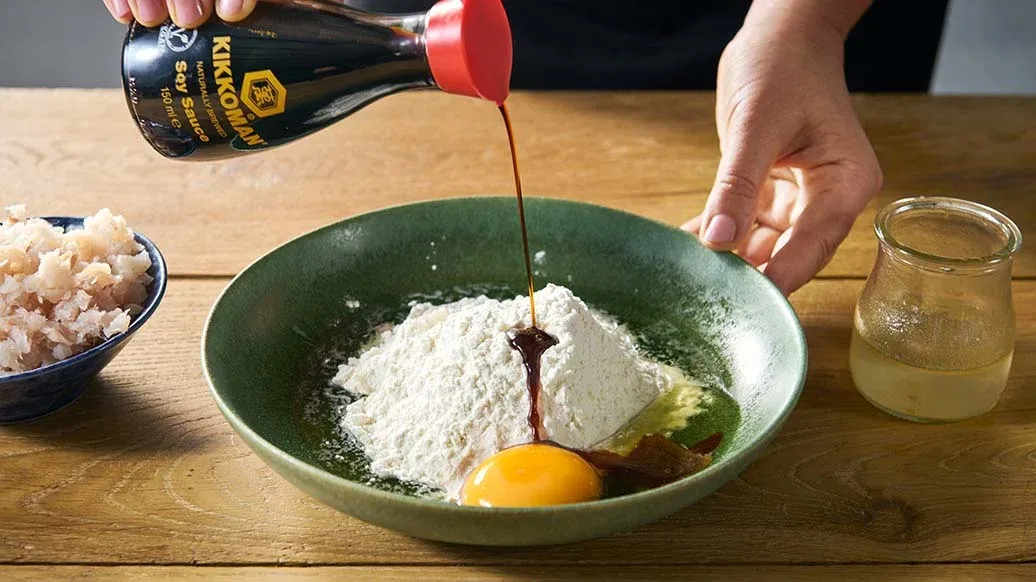 Bland hvedemel, majsstivelse, bagepulver, Kikkoman sojasauce, æg og afkølet dashibouillon i en skål. Rør det godt sammen, indtil blandingen er jævn.