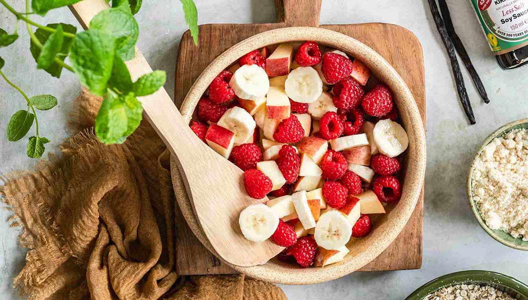Få en god start på dagen med dette ultimative morgenmadsboost: fuldkornscrumble med frugt! En sød og nærende blanding af æbler, bananer og hindbær bagt med en lækker crumble af havregryn, mandelmel og ahornsirup – en himmelsk kombination.
