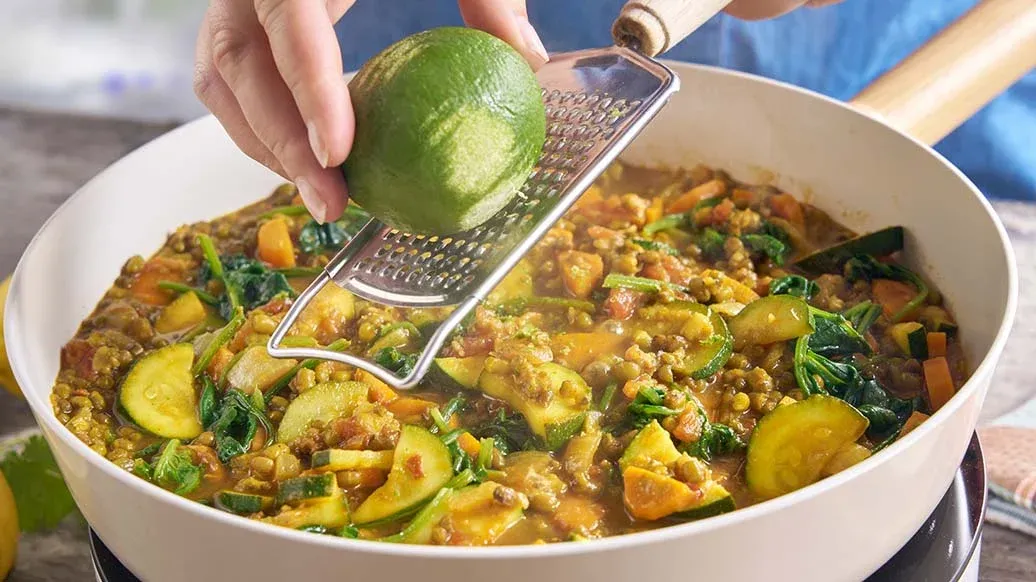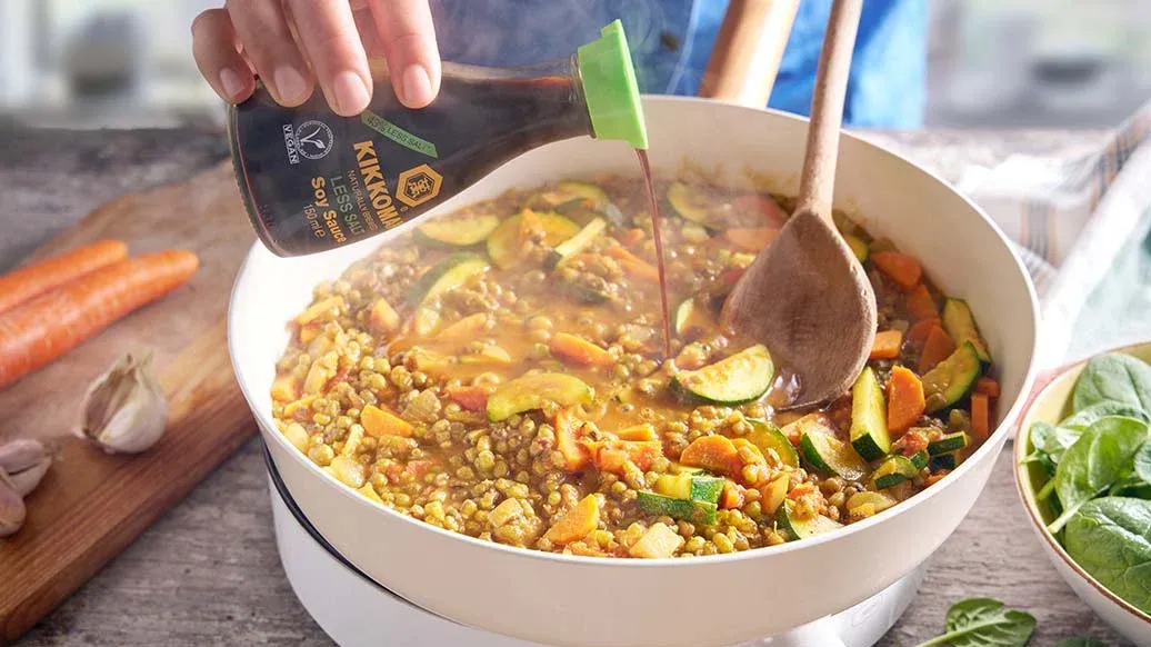 En aromatisk dal af grønne mungbønner med spinat, gulerod og tomater. Smagen piftes op med citron, limeskal og Kikkoman sojasauce med mindre salt. En let og cremet ret, der rundes af med frisk koriander.