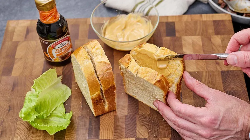 Bland mayonnaise med 1 spsk. Kikkoman teriyaki bbq-sauce med honning. Skær brioche eller brød næsten helt over, og fordel 2/3 af saucen i et tyndt lag . Skyl og dup salaten tør.