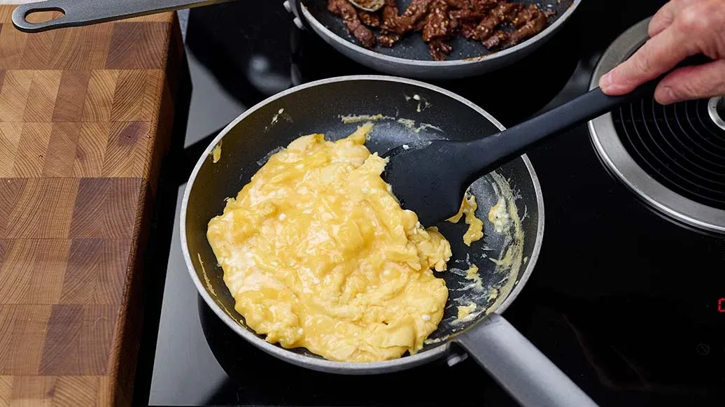 Pisk æggene med hytteost, brun farin og 1 spsk. Kikkoman teriyaki bbq-sauce med honning, indtil blandingen er lys og skummende. Smag til med peber, og steg det i varm olie på en slip-let pande, indtil æggene er luftige.