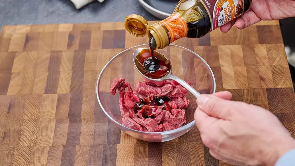 200 g oksefilet – 3 spsk. Kikkoman Teriyaki BBQ-sauce med Honning – 1 spsk. ristede sesamfrø – 1 spsk. planteolie