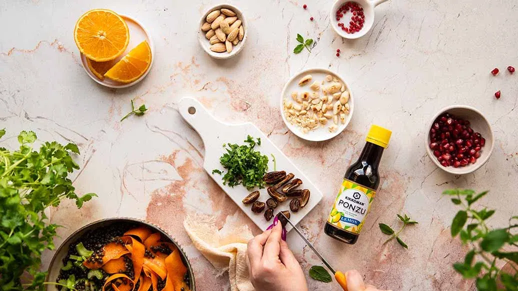 Marokkansk-inspireret salat med sorte linser, grøntsager, søde dadler og aromatiske urter – let, men tilfredsstillende. En citrusdressing med Kikkoman ponzu sojasauce fuldender retten; perfekt som forret eller tilbehør med protein, tekstur og smag.