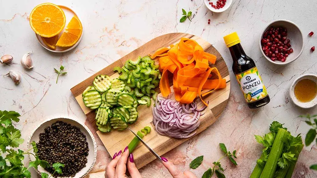 Skræl guleroden og skær den i tynde bånd. Skær agurk og bladselleri i skiver, og skær løget i tynde skiver. Bland grøntsagerne med linserne. Bland olivenolie med Kikkoman ponzu citrus sojasauce, appelsinsaft og appelsinskal, ahornsirup, hvidløg, kanel, spidskommen og rød peber i en separat skål, og rør det sammen til en dressing.