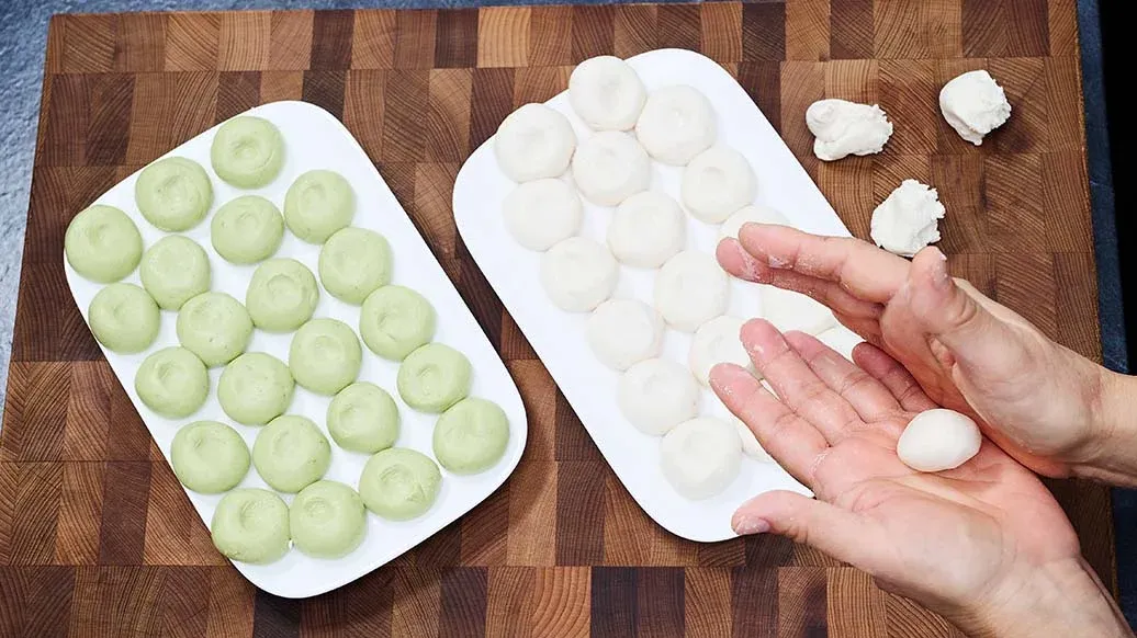 Dup tofuen helt tør, og bland den grundigt med rismel, sukker og vaniljesukker. Del dejen op i to halvdele, og ælt matchapulveret i den ene portion.