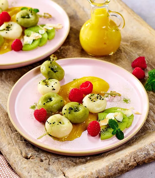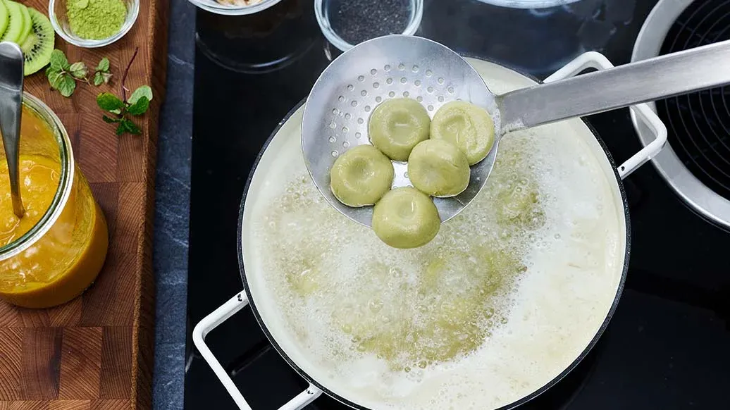 Så snart dine dumplings er tilberedte, løftes de op af vandet og køles kort af i isvand eller koldt vand. Sørg for, at de drypper af efterfølgende. Server dem på tallerkener med mangosauce, og pynt med kiwi, mynte, en smule matchapulver, sorte sesamfrø, kokosflager og hindbær.