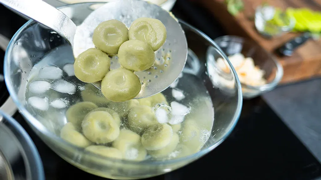 Kog dumplings i 5-7 minutter i rigeligt kogende vand (se tip).