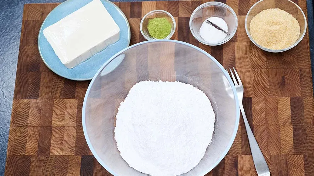 200 g silketofu – 200 g rismel – 3 spsk. brun farin – 2 tsk. vaniljesukker med bourbonvanilje – 1 tsk. matchapulver