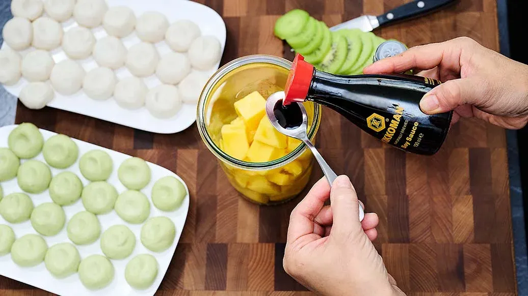 Purér mangoen med Kikkoman sojasauce og Kikkoman krydderi i mirin-stil. Skræl de to kiwier, og skær dem i skiver eller tern.