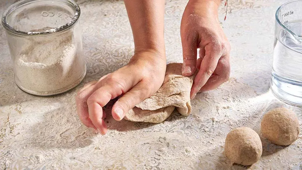150 ml fuldkornshvedemel – 20 g ekstra mel til at drysse med – 100 ml lunkent vand – 20 g klaret smør (ghee), smeltet