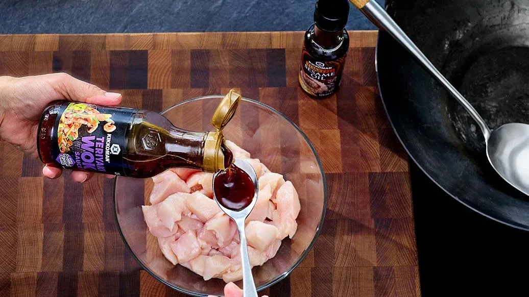 500 g kyllingebrystfilet – 4 spsk. Kikkoman Teriyaki Sauce med Ristet Hvidløg – 1 spsk. Kikkoman Ristet Sesamolie