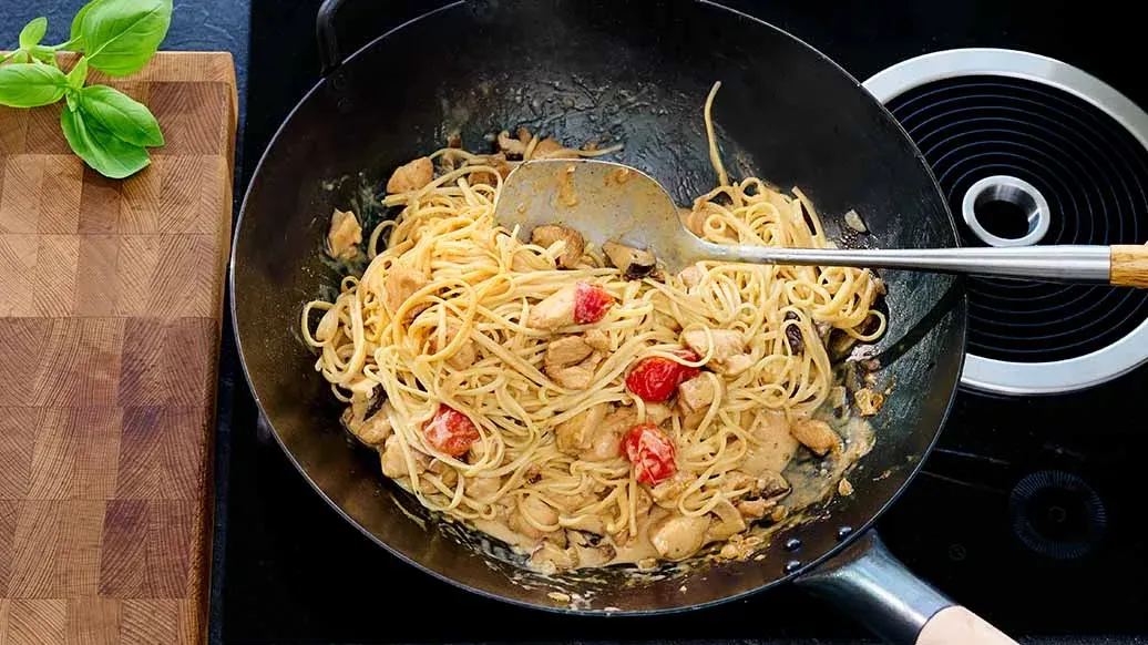 Bland saucen med pasta og kylling i wokken, anret den færdige pastaret på tallerkener, og pynt med basilikum inden servering.