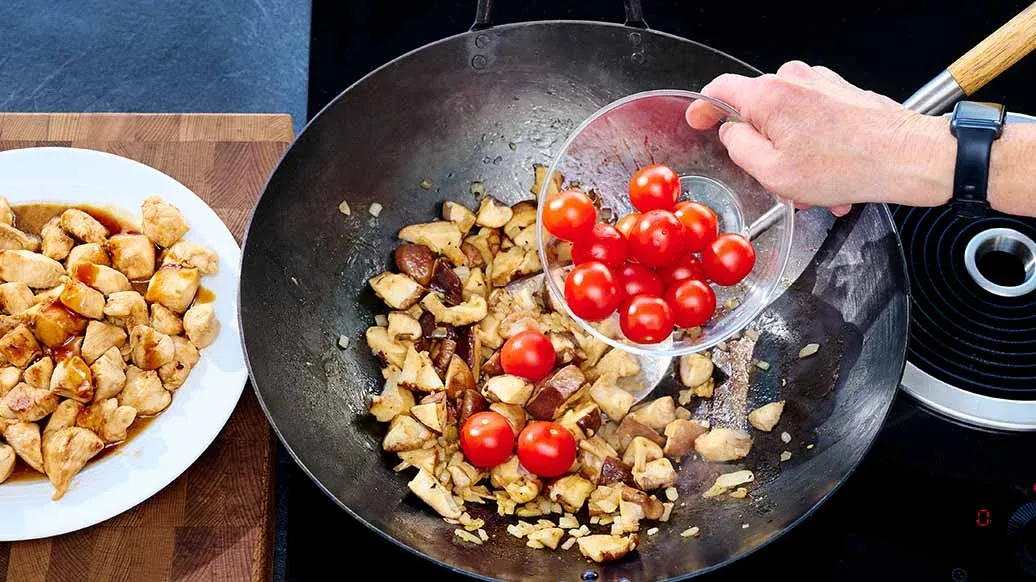 Opvarm smørret i wokken til saucen. Skær svampene i stykker på ca. 2 cm. Skær løg i tern, hak hvidløg, og steg begge dele sammen med svampene i det opvarmede smør i ca. 5 minutter. Tilsæt tomaterne, og steg i yderligere 3 minutter.