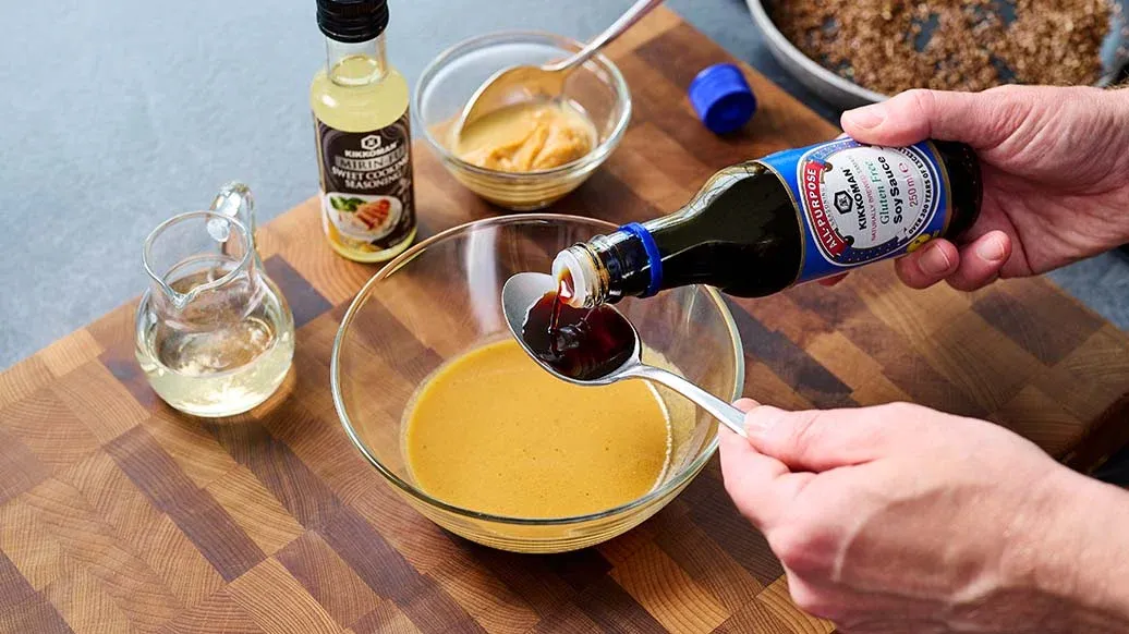 1 tsk. misopasta – 2 spsk. æblecidereddike – 2 tsk. linseolie – 2 tsk. Kikkoman Naturligt Brygget Tamari Glutenfri Sojasauce – 1 tsk. Kikkoman Sødtsmagende Krydderi til Madlavning i Mirin-stil – Friskmalet peber – 2 tsk. hørfrø (evt. knust) – 2 spsk. vand