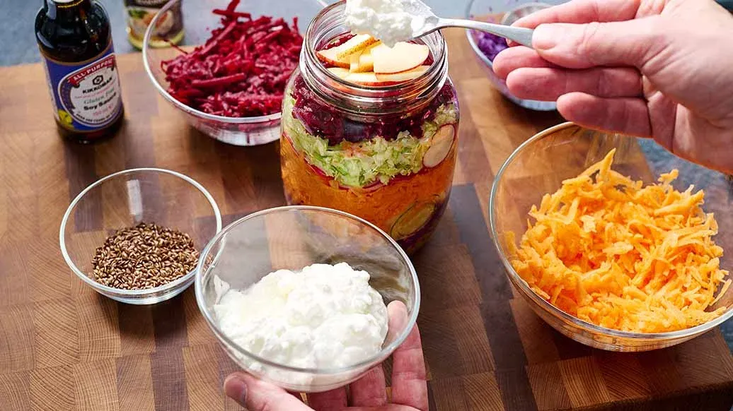 Anret salaten i et højt glas i lag på lag på følgende måde: dressing, rødkål, æble, gulerod, radise, spidskål, rødbede, pære, hytteost og hørfrø. Luk glasset og ryst det kort inden servering, så dressingen kan fordeles. Du kan alternativt servere salaten i skåle.
