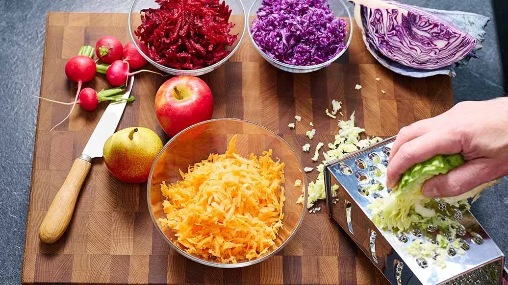 Riv spidskål, rødkål, rødbede og gulerod groft i hver sin skål. Skær radiserne i skiver, og skær æble og pære først i både og derpå i skiver.