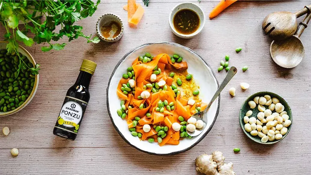 Denne friske gulerodssalat med ingefær er fyldt med smag og sprødhed. Kikkoman ponzu yuzu sojasauce har en citrusagtig note, mens macadamianødder og edamame giver knas og næring. Salaten er perfekt som let snack eller tilbehør til asiatiske retter.