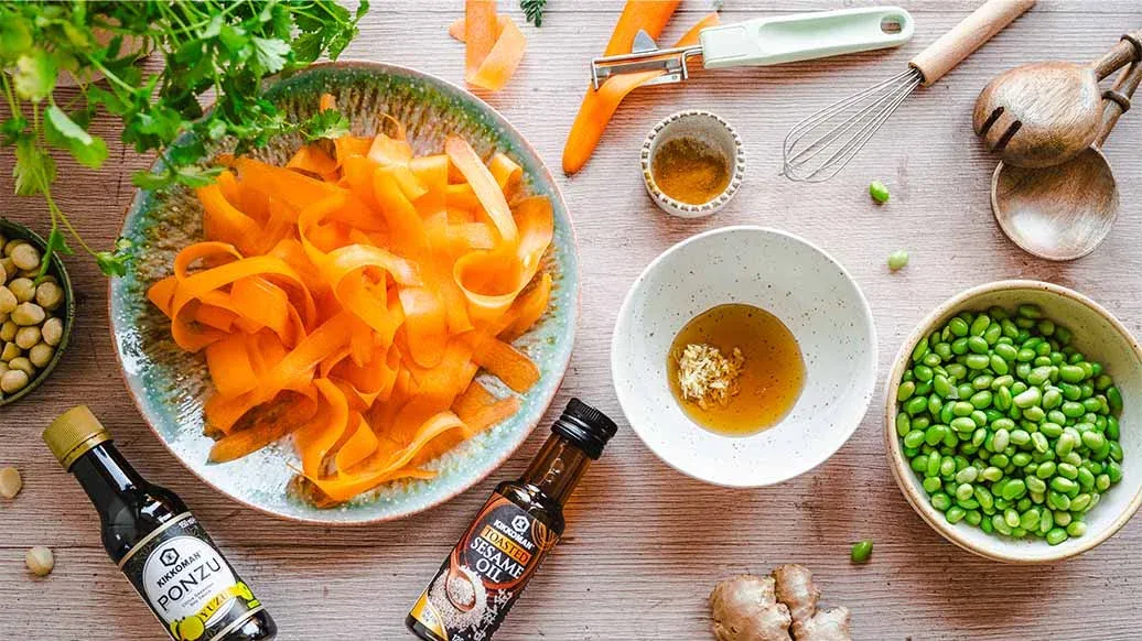 Skræl gulerødderne og riv dem i tynde strimler. Bland dem med Kikkoman ponzu yuzu sojasauce, Kikkoman sesamolie, gurkemeje og revet ingefær. Lad det stå og trække i 10 minutter.