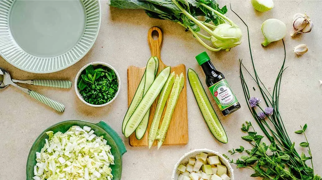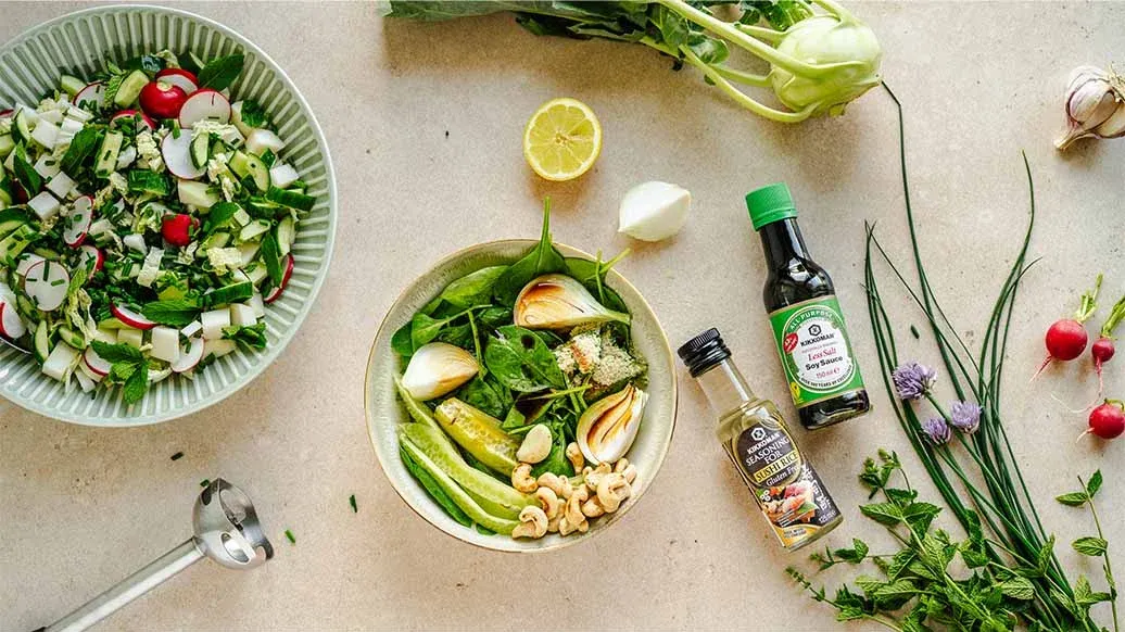 Blend spinat, løg, hvidløg og kernerne fra agurken til en jævn sauce sammen med olivenolie, Kikkoman sojasauce med mindre salt, Kikkoman krydderi til sushiris, citronsaft, gærflager og cashewnødder. Hæld dressingen over grøntsagerne og bland det hele godt sammen.
