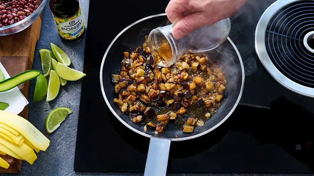Skær aubergine og skalotteløg i små tern og hak hvidløget. Varm 1 spsk. olivenolie og steg aubergine, skalotteløg og hvidløg, indtil de er gyldenbrune. Kog panden af med eddike og Kikkoman ponzu citrus sojasauce. Rør hørfrøolie i og smag til med peber.