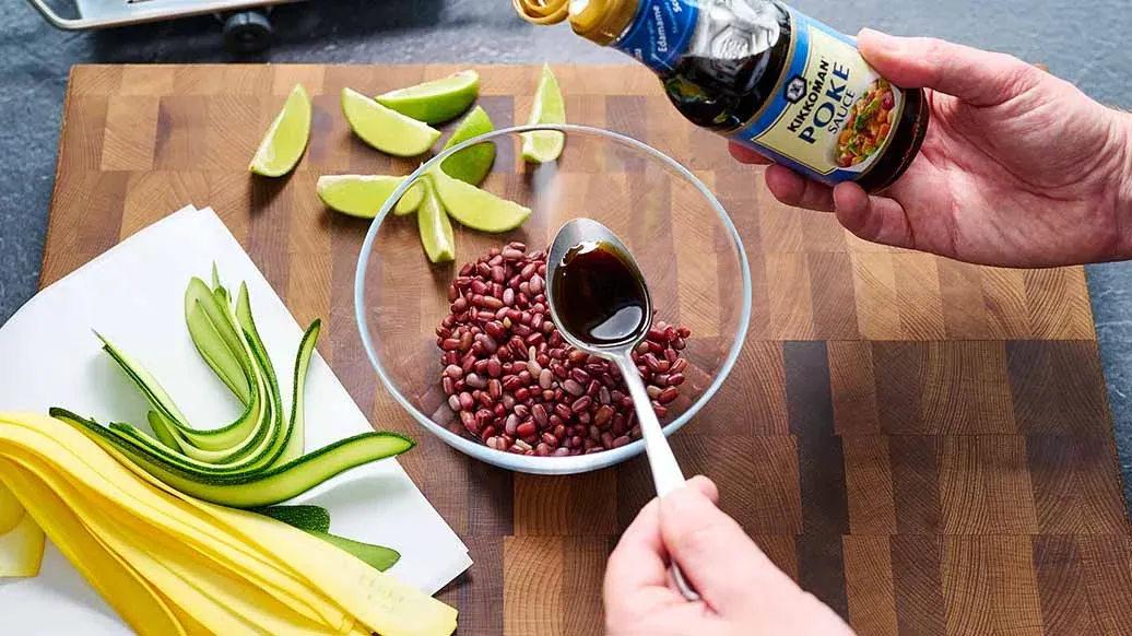 Skær squashene over på langs og derpå i skiver eller strimler. Mariner azukibønnerne i Kikkoman poke sauce. Skær limefrugten i 8 både.
