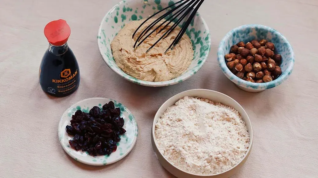 Soja-cookies med et krydret pift af sojasauce og et hint af vanilje! Tranebær og hasselnødder giver et skønt bid, og et strejf af havsalt gør dem helt uimodståelige.