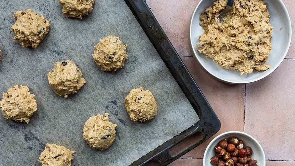Rul dejen til 5 cm store kugler, og placer dem på bagepladen med 5 cm mellemrum.