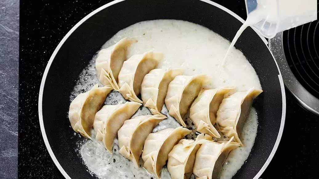 Varm 1 spsk. olie op på en pande (28 cm diameter). Læg gyozaerne jævnt fordelt i 2 rækker (à 5 stk.), og steg dem på panden. Når undersiden af gyozaerne er let brunet, røres 1 spsk. mel ud i 100 ml vand. Hæld melblandingen ved, og lad gyozaerne stege videre i ca. 3½ minutter under låg ved jævn til høj varme.