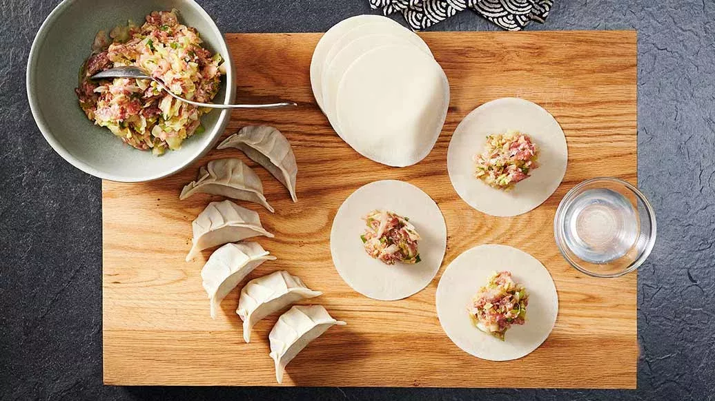 Læg ca. 15 g fyld midt på hver af gyoza-dejpladerne. Væd dejkanterne halvvejs rundt med en fugtet finger, og fold dejpladerne sammen om fyldet. Læg dejen i lette folder langs kanten, og tryk kanterne godt sammen.