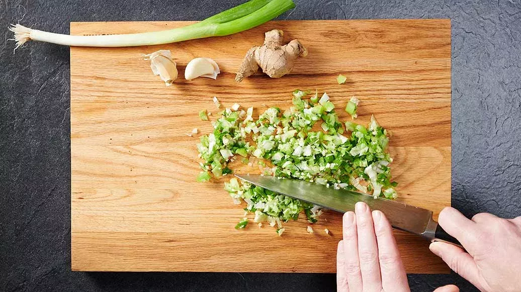 Fyld: Skyl og rens forårsløgene. Pil hvidløget, skræl ingefæren, og hak begge dele samt forårsløgene fint.