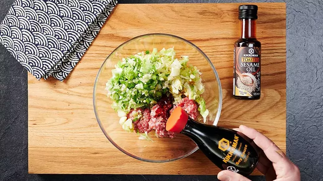 Rør forårsløg, hvidløg, ingefær, spidskål, hakkekød, sukker, salt, peber, Kikkoman Sojasauce og sesamolie godt sammen.